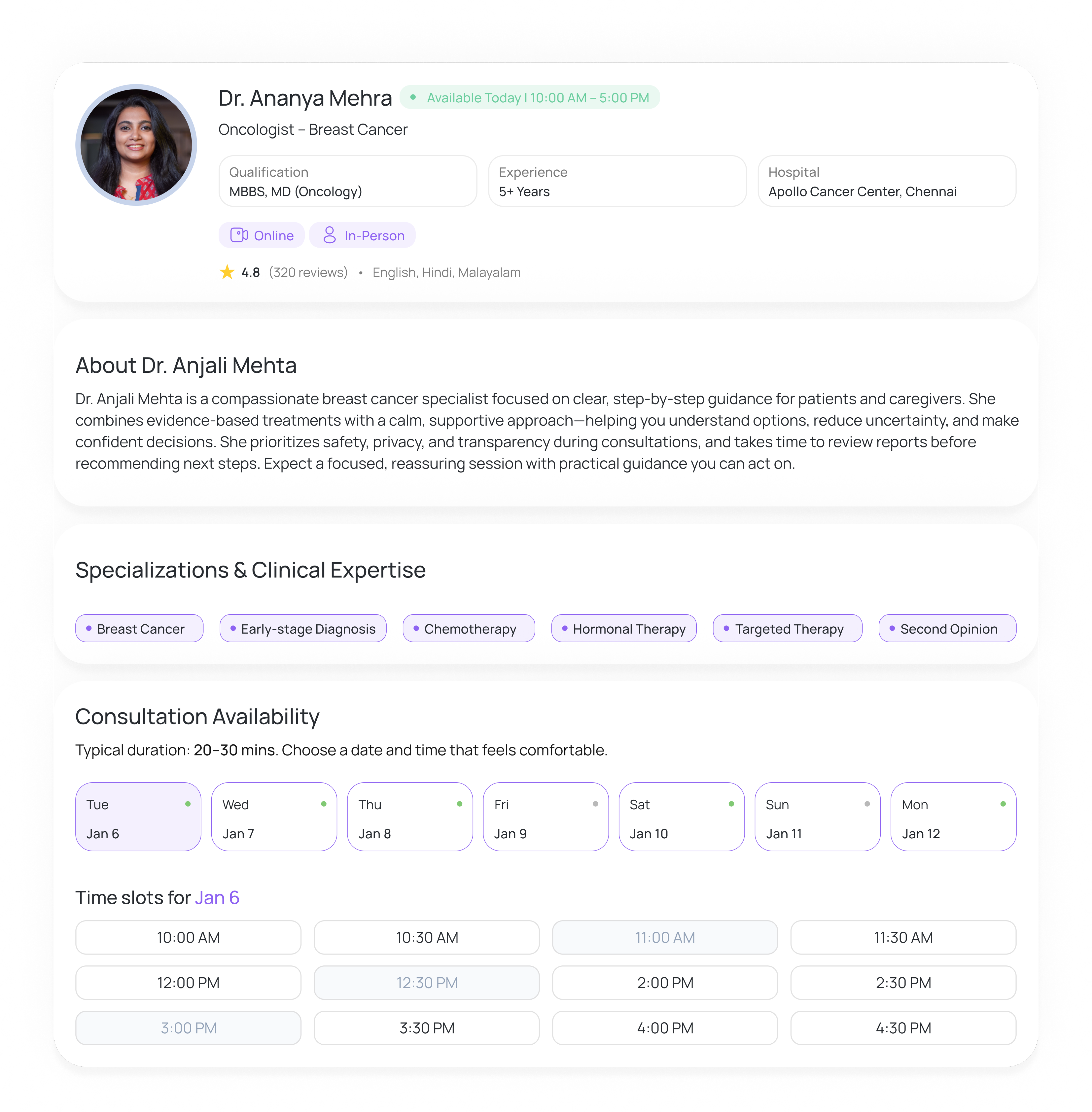 At PlanMyOnco, our purpose extends beyond medical advice. We exist to support people through one of the most challenging journeys of their lives with clarity, compassion, and dignity. Our role is to ensure that every patient receives thoughtful guidance, expert-led decisions, and a clear path forward, without feeling overwhelmed or alone.