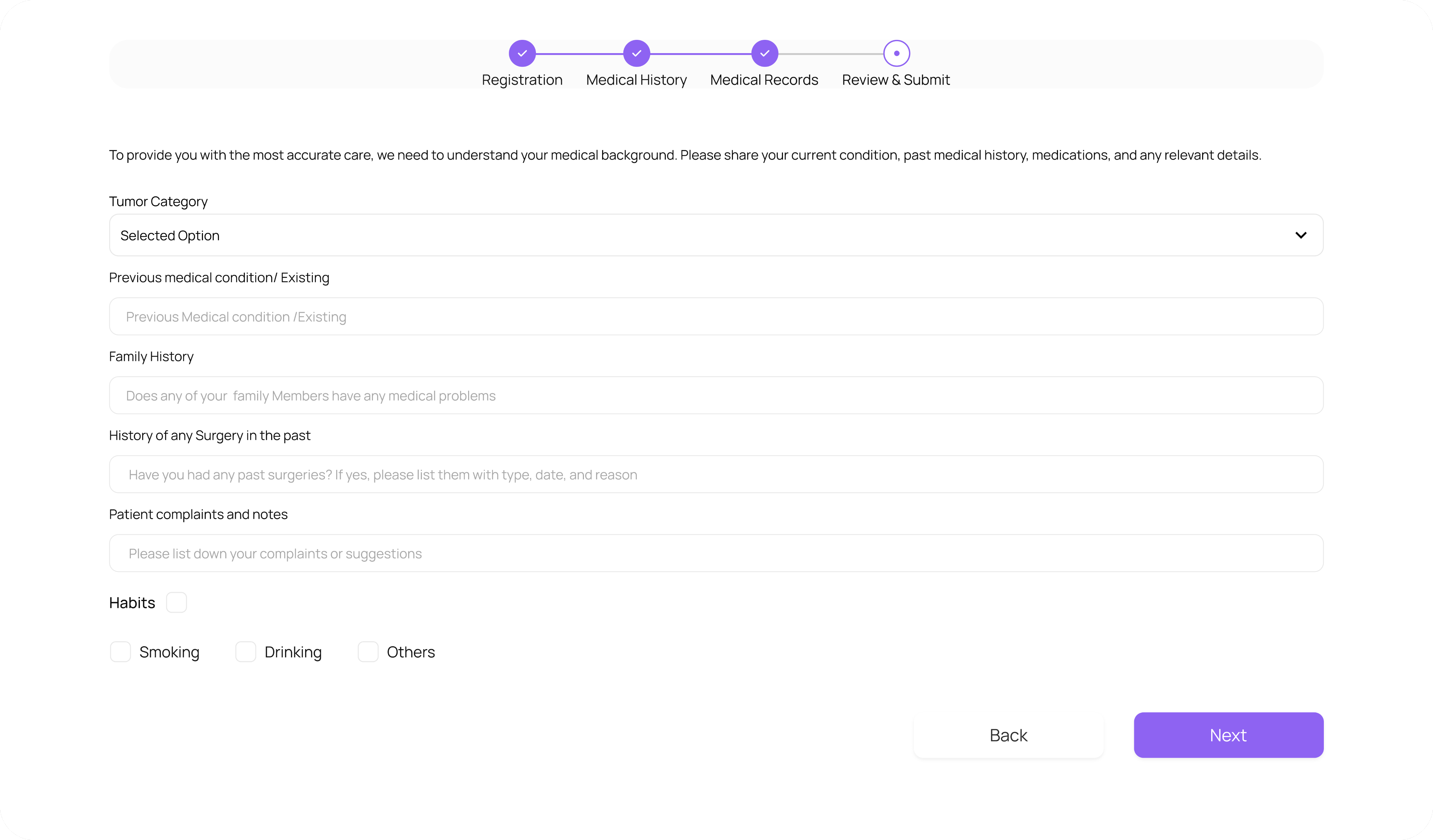 Create your account, then securely upload your medical reports, scans, and relevant patient information.